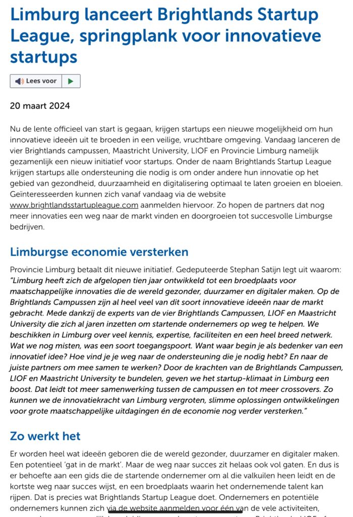 door: Fred KnarrenGeplaatst op: maart 21, 2024april 22, 2024 Brightlands Startup League Bron: Nieuws Provincie Limburg 20 maart 2024 Lees hele artikel: https://www.limburg.nl/actueel/nieuws/nieuwsberichten/2024/maart/limburg-lanceert-brightlands-startup/