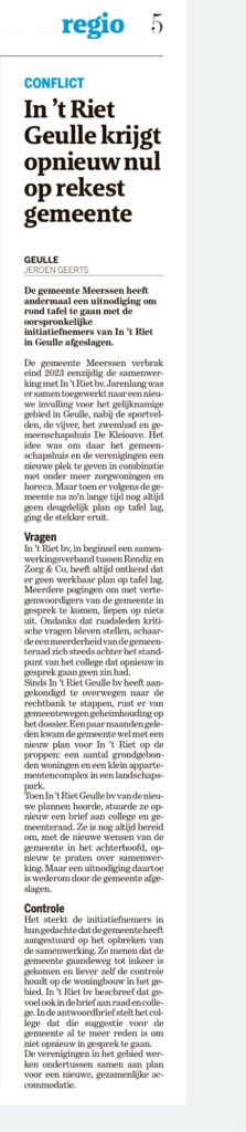 In ‘ t Riet BV tekende 12 jaar geleden een intentie verklaring over nieuwbouw op de plek van voormalige basisschool In ‘t Riet. Nieuw leven blazen in overleg met gemeente Meerssen mislukt…